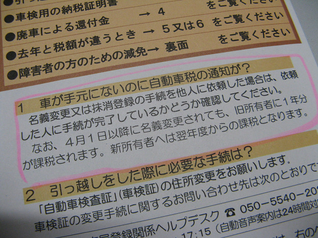 恐るべき自動車税の罠 春です、税金の季節です、今年もガッツリと搾り取られる・・・。 それはさておき、今回は思い切り失敗談を。 先日、ウチに税金の納付書が届いた。 ・・・あれ?自動車税の納付書が二枚??? 先月、車を新たに買い替えたのがその発端であった。 上の写真の説明には「4月1日現在で名義を持っていると課税対象となる」という事らしい。 実は今の車が登録されたのは三月、そして前の車を廃車にしたのが先月。 つまり4月1日時点で、車は手元に無くても二台所有しているという事になっていたのだ!! これはうっかりしていた・・・その事実を知ってかなり凹んでしまった。 対策としては納車が間に合わないのであれば、先に前の車を廃車手続きをしてしまえばよかったのである。 これを知っていればそれなりの対策が取れたものを・・・。 という事で車を乗られている皆様、買い替えの時期にご注意を。 [0回]PR