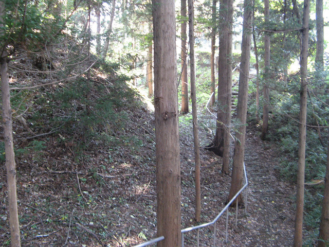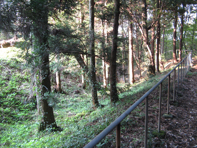 勝保沢城 (群馬県赤城村) 猫城の探訪中、ちょっと気になっていた「赤城歴史資料館」へ行ってみる事にした。 赤城歴史資料館は入館料大人1人100円。 情報を期待して入館するも、メインは古墳時代の土器や農耕具ばかりで城館の事はまったく無かった。 ちらりと赤城村誌を拝見させていただき、退出なり。 それより気になっていたのはこちらの堀。 そう、赤城歴史資料館は中世期の城である「勝保沢城」の曲輪に建っていたのである。 ここって今まで見てきた旧赤城村の中で一番遺構が綺麗に残っているみたいだ。 本曲輪と思われる一角は手すりが備わっており、ちょっと進入はできないようだ。 だが草は刈られており、その美しい遺構を見る事ができる。 何気にここで何枚か写真を撮ってしまった。 この位の堀が残っていると本当に嬉しくなるものだ。 先の津久田城もこの位遺構が残っててくれたらと思ったりも。 ぐるっと周って堀底をちょっと経由して再び階段を登ると歴史資料館に戻る。 これだけ良い遺構が残されて居るにも関わらず、解説板一つも見つからなかったのは残念だ。 もしかして見つからないだけで、どこかにあったのだろうか? 駐車場挟んだ反対側の竹やぶも実は堀跡である。 ちなみにこの堀の向かいの寺も勝保沢城内だったというが、遺構は乏しいという。 歴史資料館があるので、この城の探訪に関しては問題無い様にみえるが、 実はその南側は幼稚園でヘタにカメラを持って歩いていると保護者に誤解される恐れがあるので要注意。 でもいい堀を見させてもらって感謝。 [0回]PR
