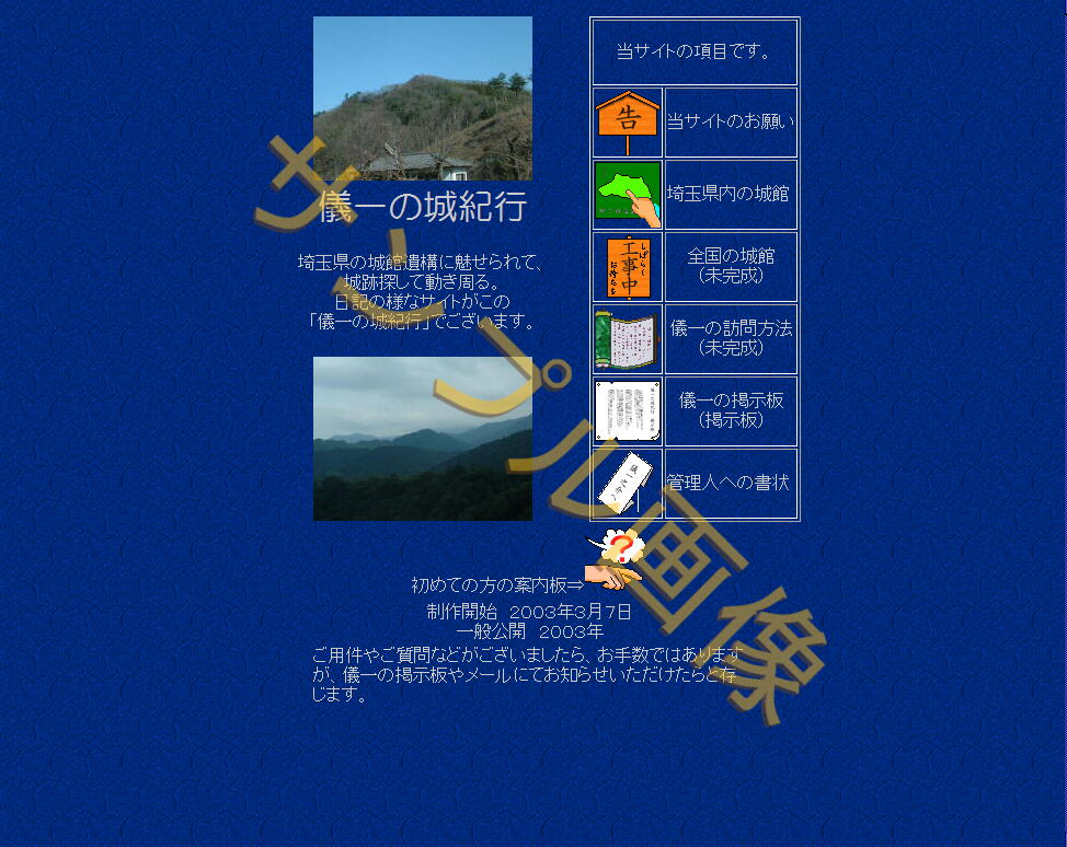 珍しいものを発見 以前の当サイトの雛形ファイルが発見された。 今から7年前にこんな形にしようかと思案を重ねていたもので、web上では初公開となる。 現在の「儀一の城館旅」に比べて、結構トップ画像がシンプルだ。 ちなみにアイコンもわざわざ手づくりで作られているので、わりと凝っている。 [0回]PR