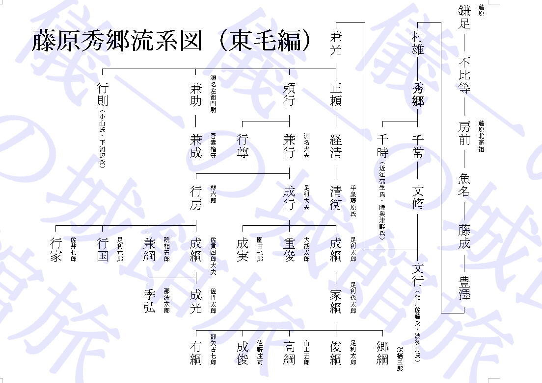 系図の迷宮の中で 今日は晴れていれば城館探訪する予定であったが、雨なので家で系図作りに勤しんだ。 今回挑戦したのは、あの藤原氏の系図である。 藤原鎌足から始まって・・・不比等・・・京家、北家、南家、式家と分かれて・・・ っと見ていく内に恐ろしい程の大人数になっていた。 この調子で増えていったら、日本人全員が藤原ファミリーなんでないかと思う位に。 途方もない上に城館と関連が薄いので、本家本元は保留。 代わりに関東に関連ある藤原秀郷流の系図を作成してみる事に。 今回使ったソフトはword2003で主要参考文献は「大間々町誌 通史編 上巻」である。 こんな感じに仕上がった。 名前を入力し、オートシェイプで線引きするだけで、わりと立派な系図が完成。 プリントしてみたら、この半分の文字サイズでいけそうである。 欲を言えばもう少し行間隔を狭められれば良かったかな。 この調子で武蔵七党の系図も挑戦してみたいものである。 [0回]PR