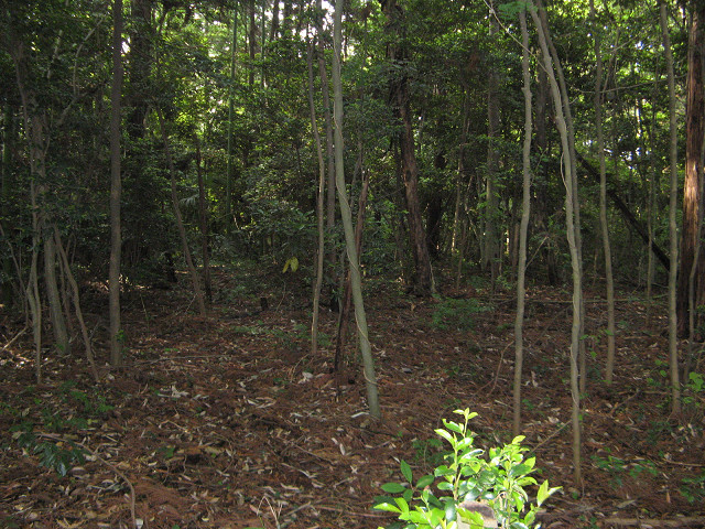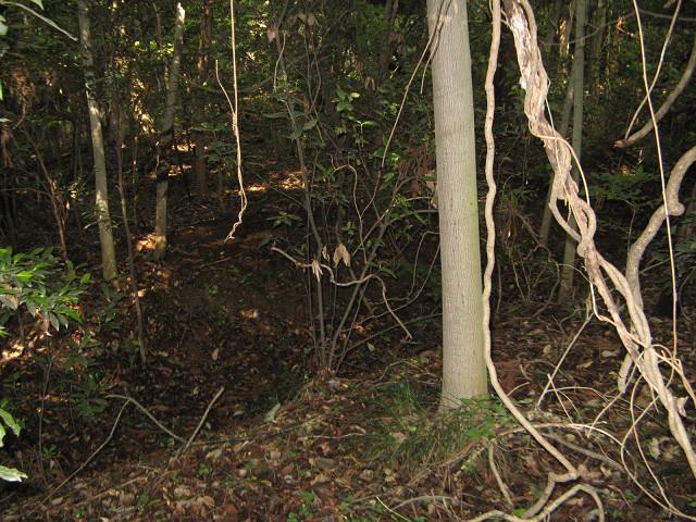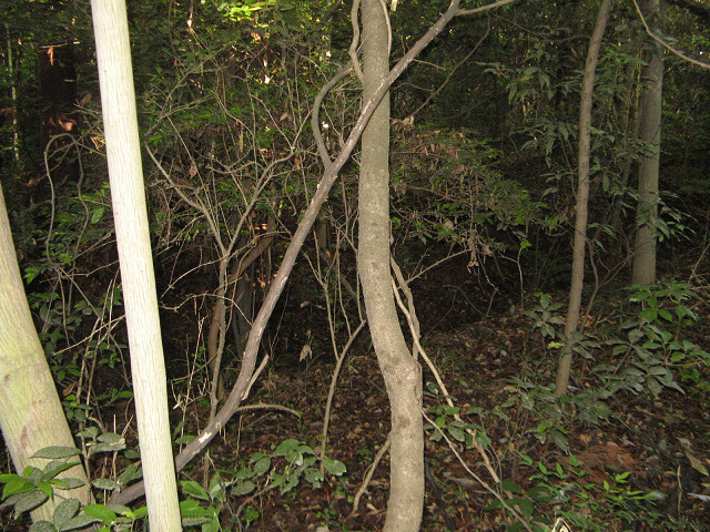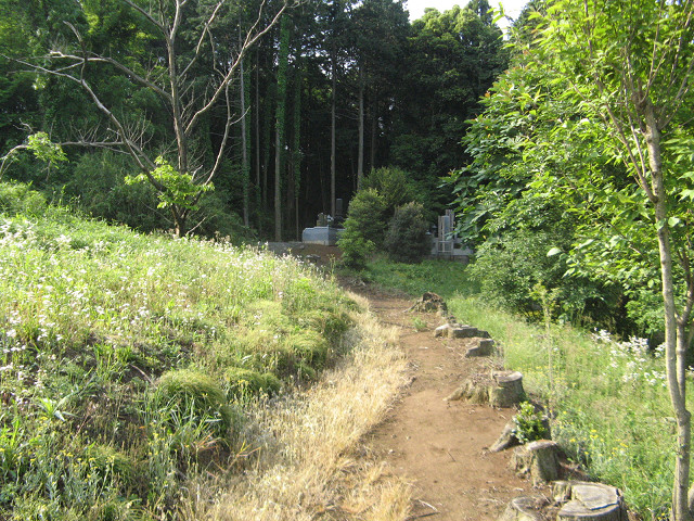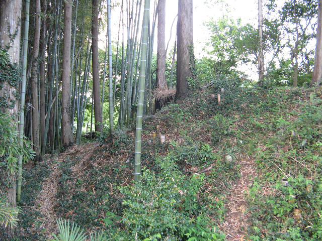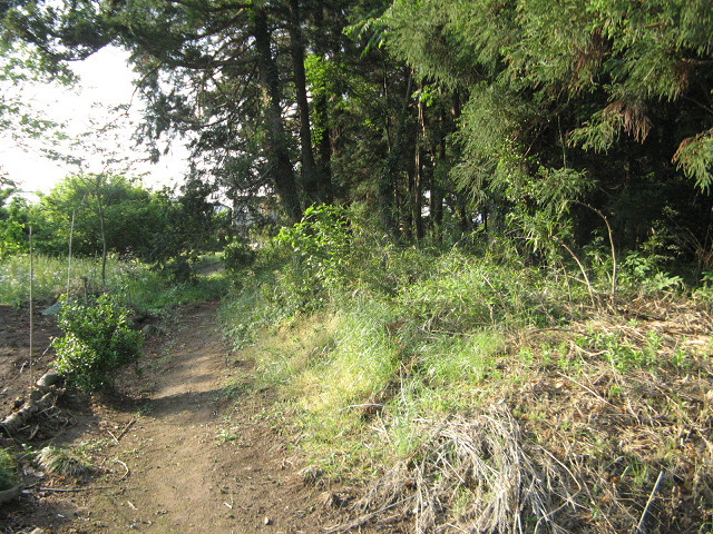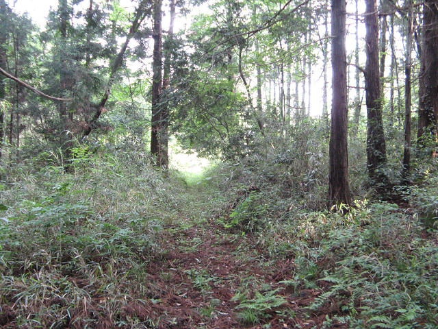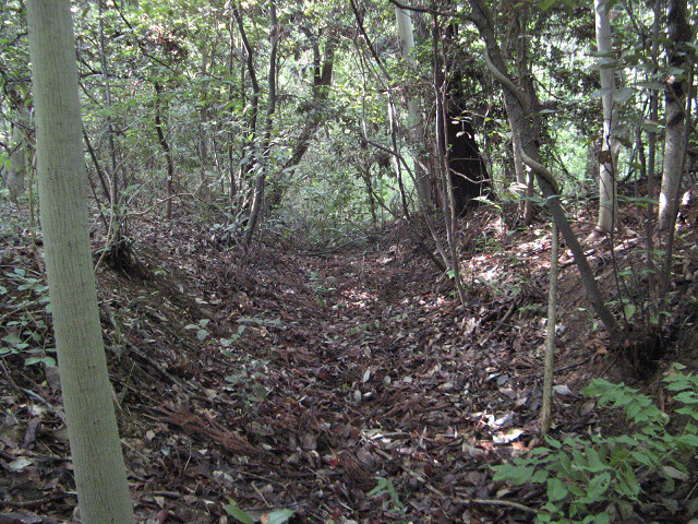 鷹巣字陳場(埼玉県大里郡寄居町) ついに気になってしょうがなかった「陳場」へ訪れることとなった。 寄居町の小字の調査をしている時、「陳場」なる地名があり「明らかに陣場の間違いだろう」と思っていたので、これが誤爆で終わるかどうか?楽しみである。 陳場と呼ばれるところは比較的小高い丘になっていた。 北側は民家と畑になっているが、南半分は雑木林となっている。 陳場付近からも高見城が望める環境で、距離も直線距離にして大体1.8km程ある。 畑の脇に雑木林の中の墓地への道があるので、そこを利用して雑木林へ移動してみる。 今回は流石に藪の可能性もあるので藪突撃装備をしての侵入である。 一応平たく感じるが・・・自然地形とも言えなくもない。 周囲を回れるだけ回ってみよう。 西側はかっての道であったようで、多少窪みがある程度で堀とまでいかない浅さである。 ただこれより西は徐々に地形が落ちて、脇の農業用のため池に直行する。 流石にため池に落ちては危ないのでこちらはこの辺りで引き返す事に。 む!?なにやら不自然な窪みを発見。 少々浅いものの、自然地形にしては手のかかったような窪みである。 窪みはおおよそ2mほどの長さで、意味もなく唐突に掘られているような感じである。 うーん、これだけじゃ分からないので、陳場の南東には細く伸びる尾根があるのでそこへ行ってみる。 更に長い溝が登場した。 深さはおおよそ50cmほどだが、何故か尾根を斜めに区切っているように見える。 里道か?あるいは堀切か? でも堀切にしては浅いのでなんとも判断の難しい場所である。 なお、ここより先に行ってみたが、竹薮が激しくなってきたので撤収した。 我がら武蔵直登の猛者の皆様なら突撃しそうだが、ヘタレな自分はそのまま引き返してしまったのだった。 藪の中ではあるが、100m東を関越自動車道が走っている為、車の走行音が絶えず響き賑やかである。 そのまま丘の東をグルッと回ると竹の群生している場所へ来る。 竹の生えてる所は竹が生え広がるのを防ぐための「根除け堀」の可能性もある為、城館遺構と判断するのは早計である事が多い。 もう農地に近いことからもこれは道であった可能性もある。 なお、肝心の尾根続きは民家や農地になっている為、現時点での地形では判断が難しいと思われる。 陳場を南側より望む。 両脇を谷津に囲まれた地形で、要害の地に見えてしまう。 なお、地元の方に陳場について訪ねた所、読みは「じんば」であるという。 やはり登録する際に誤って陳と書いてしまった可能性が充分高まったのであった。 色々と謎の残る陳場、ここは色んな方に来てもらい、あの溝の謎を考察して貰いたいものである。 陳場の場所 → 地図へ かくして次なるまがい地へ向かうのであった。 つづきはこちら [0回]PR