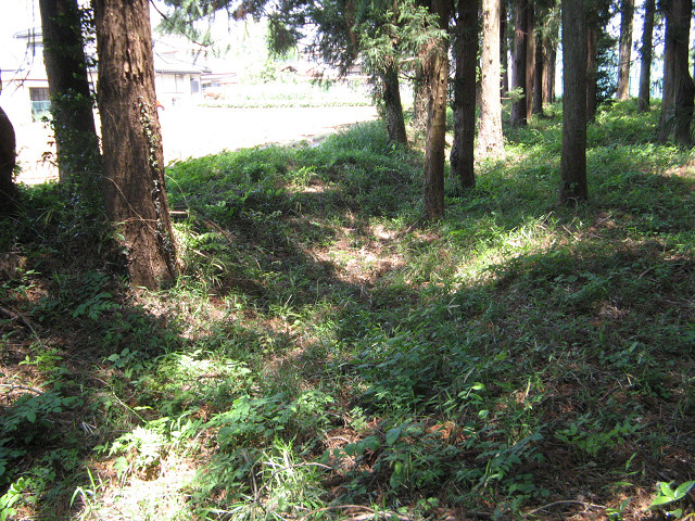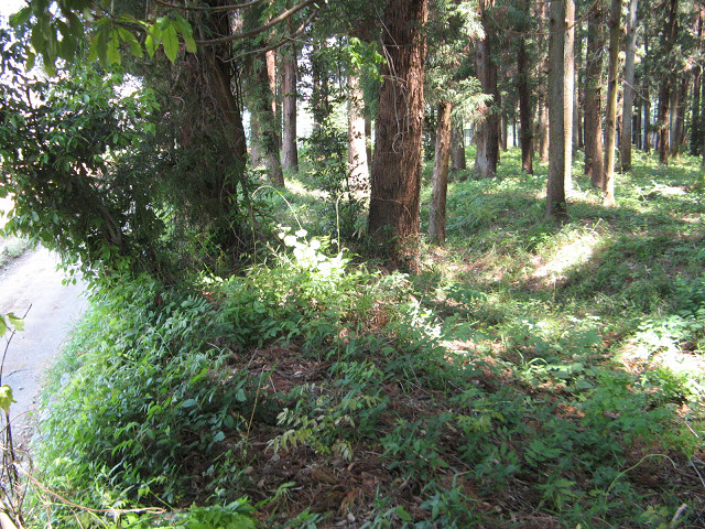 守邦親王仮寓地 当サイトとリンクされている「城跡ほっつき歩き」と「そこに城があるから」で同地が紹介されているので、詳しい事は各サイトへ委ねてっと。 中世城館まがい地候補として名高いこの地は、前々から訪れて見たかった所であった。 住宅地の奥にある茂みが仮寓地であったとされる八幡神社である。 こうやってみると本当に城館っぽい雰囲気がある。 八幡神社境内に到着。 この辺りは小川町の市街地に程近いのだが、近くでウグイスが鳴いていたりと実に風情がある。 解説板にも守邦親王が鎌倉幕府滅亡後、この地に仮寓した際に八幡神社を創建した旨が書かれている。 あくまで言い伝えなので真実か分からないが、もしそうだとしたらワクワクする話だ。 八幡神社の南側は堀底道とも思える道となっている。 道路の南側はたしかに土塁になっているのだが・・・更に南には県指定史跡である穴八幡古墳があるので、そちらの遺構である可能性も。 神社の西側の杉林には謎の窪みが・・・かなり浅いものの堀に見えてしまう。 もう一丁違う角度から。 道路に並行して溝が南北に伸びているのだが・・・写真じゃわかり辛いのが残念。 溝の北は運動場造成によって喪失してしまっていた。 こちらはかって馬場であったという話も出ており、今昔で運動する場所になっているのは何の因果か。 実は八幡神社の北東にも怪しげな土塁が存在する。 こうやって神社の周辺を周ってみると、方形館としても不思議でない趣がある。 その真相についてはいつか発掘調査でもする機会があれば判明するのだろう。 ちょっとした散歩もできたし、城館跡であるかは別にして楽しく歩かせてもらった。 [0回]