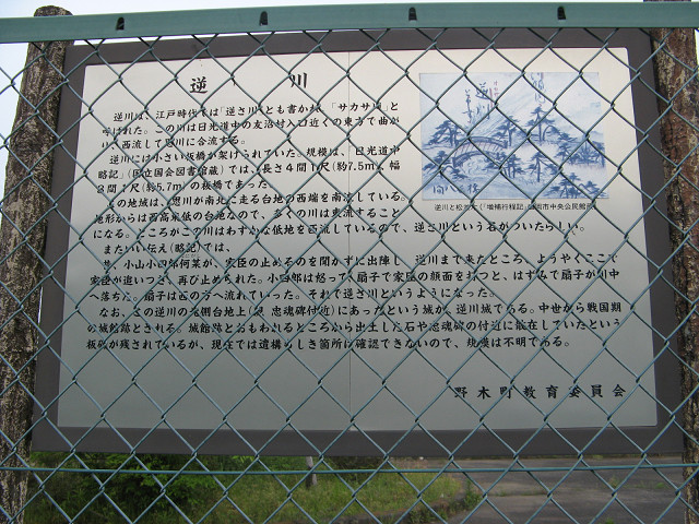 下野国田園城館探訪ツアー その4 法音寺城は比較的(多少埋もれているが)良い堀を残していた。 近くにありながらそれと対照的に遺構が不明な逆川城へ向かった。 ●逆川城(栃木県下都賀郡野木町) 別名「友沼城」ともいう。 ここもまた思川岸に作られたと思われる城だが、その遺構は不明瞭。 この忠魂碑の辺りで板碑が多く出たらしく、この辺りを歩いてみるのが手か。 ここより南は低地になっているので、北側の小高いところを歩いてみよう。 っと歩いてみたが、これは少々厳しい保存状態だ。 若干高まりになっている程度で、「おおよそこの辺りか」程度の推測しかできない。 城跡から見る今日の太陽は、一段とボンヤリしている。 今日はこんな天気の中城館探訪するのかなっと思いつつ、踏査をしていく。 城の北側にあたる部分で、少々谷が切り込んできているのが少々好感あり。 でも城の遺構と呼べるようなものでないような・・・。 諦めて城を後にしたとき、城の南にある逆川の河川設備のフェンスに城に関わる案内板が。 今のところ訪れている4箇所で最も遺構が不明確なこの城にだけ備わっている案内板、このアンバランスさがいいのかも知れない。 (他の城にも案内板があったかも知れないが、今回は当方発見できず) 遺構の保存度を優先する方々には多分不満が残る野木町。 でも個人的には好きな遺構が多くあったように思える。 それにしてもこの逆川城の遺構が不明瞭なのは想像をかき立てられていい。 かくしてまだまだ城の探訪は続くのであった。 つづく [0回]PR
