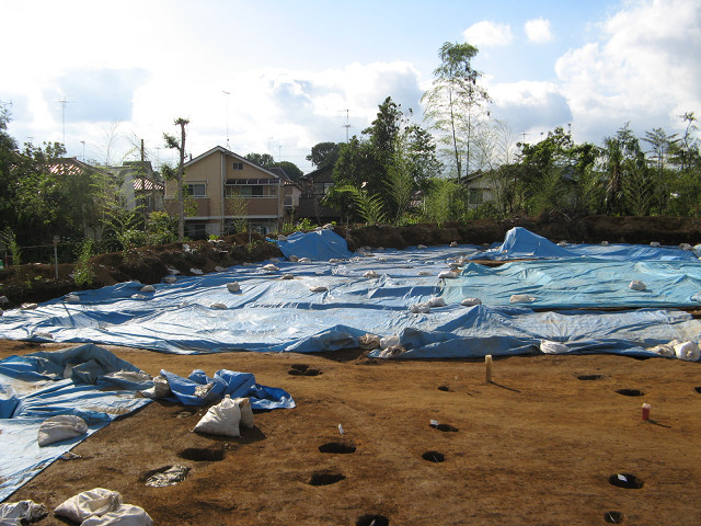 多門氏館(埼玉県富士見市) 多門(おかど)氏館は中世期の館跡に徳川氏の旗本多門氏が住んだことから因む名前である。 以前は何故か木が生い茂ってるという理由で撤退していたのだが、やはり訪問していないのは気がかりだった。 そこで今回の訪問となった訳である。 前は森だった多門氏館が、綺麗に伐採されて発掘調査されていた。 なんのめぐり合わせか?館跡は今新たなる真実を求めて掘り返されていたのである。 堀はしっかりと従来の姿を取り戻しているようだったが、残念な事にブルーシートが被っているので中が伺い知る事ができなかった。 でもこれを見るだけで結構深い堀のようである。 館跡内部もしっかり発掘されており、幾つかの柱穴が顔を覗かせている。 中世期の屋敷は基本的に掘立式であり、家の柱を建てるのに当然穴を掘っている。 この穴のお陰でその館跡にはどの位の規模の屋敷が建っていたか、垣間見る事ができる。 他のサイトでは木が生い茂っている写真が多かったが、これを行った時には見事な見ごたえがあった。 本当は発掘調査をされている調査員の方に話を伺いたかったのだが、忙しそうに動いておいでだったので声をかけるのを控えた。 後日同地を再訪問された「そこに城があるから」の左馬助さんの話によれば、住宅開発による発掘で遺構は喪失してしまうとの事。 確かに中世期の館跡なら液状化現象の心配はほぼ無いが・・・できたら後世に残して欲しい遺構の一つでもあった。 この日は心残りが無いように、徹底して撮影してきた。 せめてこちらの堀は残して欲しいものだ。 [1回]PR