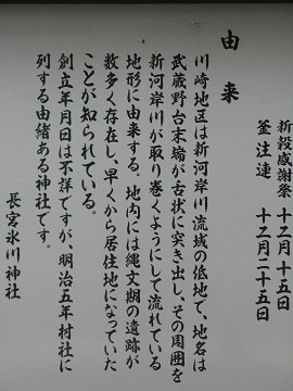 川崎遺跡(埼玉県ふじみ野市) 元上福岡市川崎地区には「川崎遺跡」と呼ばれる複合遺跡があった。 前々からその所在地は知っていたが、行く機会が無かったので行ってみた。 台地の西下方にある葦原中学校付近より台地を見る。 せいぜい高さは2m以内であったりする。 市街化の進行が著しい旧上福岡市内でも、この辺りまでくると広い畑が残されていた。 既に発掘調査はされているかも知れないが、宅地になっていなければ生きてる内にその謎が明らかになる機会があるだろう。 川崎遺跡のほぼ中心付近には川崎氷川神社がある。 周辺が畑なのでポツンっと建っているようにも思えたりする。 境内にある看板には以上の事が書かれている。 川崎遺跡の内容は主として縄文時代の遺構のようである。 川崎地区はその名が示すとおり川に突き出るように台地が飛び出している。 この周辺には寺尾城や福岡城といった中世城館跡が新河岸川沿いにある。 そしてこの川崎地域は上記の城の中間ぐらいのところに位置している事を踏まえると河川掌握の砦ぐらいはあったのかも知れない。 って事で次なる場所へ移動するのであった。 [0回]PR