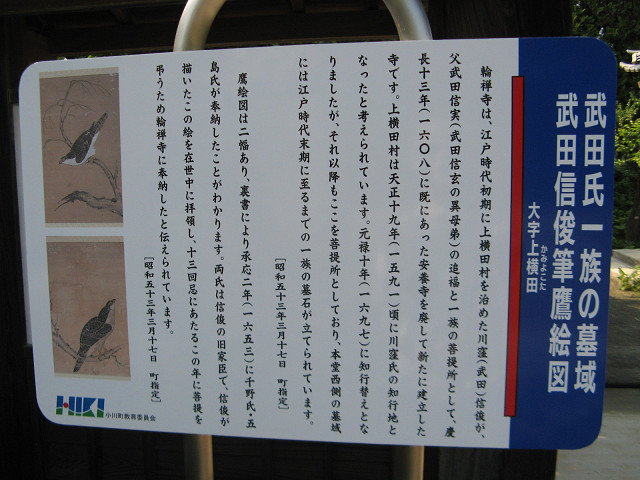 川窪氏館(埼玉県比企郡小川町) 竹沢氏館より国道254号線を東京方面にちょっと走らせて、川窪氏館へ。 一般的には「武田信俊館」と言われているようだが、ここに住んだ時点では「川窪」姓を名乗っているのでこれに従ってみる。 川窪氏の館があり、墓所があるのが現在の輪禅寺である。 丁度寺が西から伸びる尾根上にある。 輪禅寺の山門前より東を見る。 特に意味はないが、国道254号に近いながらも随分とのどかなので、和んだ。 さて、肝心の館跡へ。 新しく山門脇に作られた解説板は「武田氏」を強調しているようにも。 確かに「川窪氏」じゃ「誰?」って言われてしまうのもオチだし・・・。 写真の鷹の絵、細かいところまでよく書けていて川窪信俊の絵の才能を垣間見る良い機会だった。 (それまで絵を描いている事すら知らなかった・・・) 墓地の中央には川窪氏の墓所となっており、格式の高い宝篋印塔が建てられている。 笠などに欠損なくしっかりと保存されているのは輪禅寺の歴代住職様に守られていたからであろう。 っと見たいのはあくまで遺構なので、この辺りで遺構を探しに行く事に。 っと本堂の後ろ(北)にいきなり土塁のような高まりを発見。 更に別角度で見ると・・・ 虎口? 見えなくもないが・・・ちっと微妙な感じがしていたりする。 実は後で尾根を断ち切るように堀があるか確認するの忘れてしまった。 また機会を見てお墓の西側を調べさせてもらいたいものだ。 [0回]PR