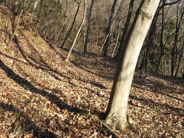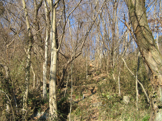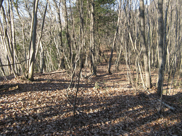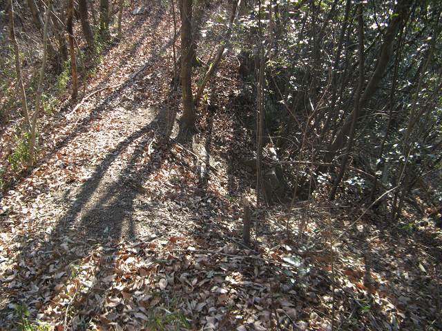 根岸山砦 ●根岸山砦(埼玉県秩父郡皆野町) 荒川流域に砦で、堀切があるという噂があるが真相を確かめるべく訪問。 南面は荒川が荒削りした跡と思える岩壁になっていて、自分はこちらから登るのはほぼ無理。 このまま東側に回りこむ。 山沿いに東へ歩いていくと十二神社への入口を示す石碑がある。 砦のある山へはこの石碑が目印となる。 登りは写真の直登コースと比較的緩やかな蛇行コースがある。 少々体力を温存したかったので、今回は蛇行コースでのんびり歩いていく。 枯葉の滑りに気をつけながら登っていくと、途中で遺構とも思える平場に出る。 山裾は広かったと思ったが、この辺りで両側は急に落ち込んでいる。 その事を考慮すると城戸なのかも知れない。 十二神社のあるピークに到着する。 上は綺麗に削平されており、中央には十二神社の社がある。 周りの風景を見る。 南方は眼下の荒川越しに秩父盆地を見渡す事ができる。 千馬山城は少々奥に入った所にあり、こちらの方面は蓑山があって見ることができない。 そこでこの方面の監視を補う形でこの砦が作られたのがよく分かる。 西側の標高の高いところにも行ってみた。 こちらは完全に自然地形である上に、北側が緩やかである。 私見になるが西には宝登山があり、この場所は写真の宝登山に見下ろされる形になる。 そこでこの場所を放置して十二神社のあるピークを選んだのだろう。 つまりは高所に作る事よりあの場所に作る事で目的を果たせているので作っていないという事か。 さて、肝心の堀切は? ・・・コレの事を指しているのか、大目に見ても土橋という感じであろうか? 自然地形にも見えなくも無いので判断が難しい所。 ピークを削平したという到ってシンプルな遺構だが、実用的という印象の受ける砦であった。 [1回]PR