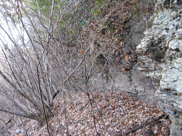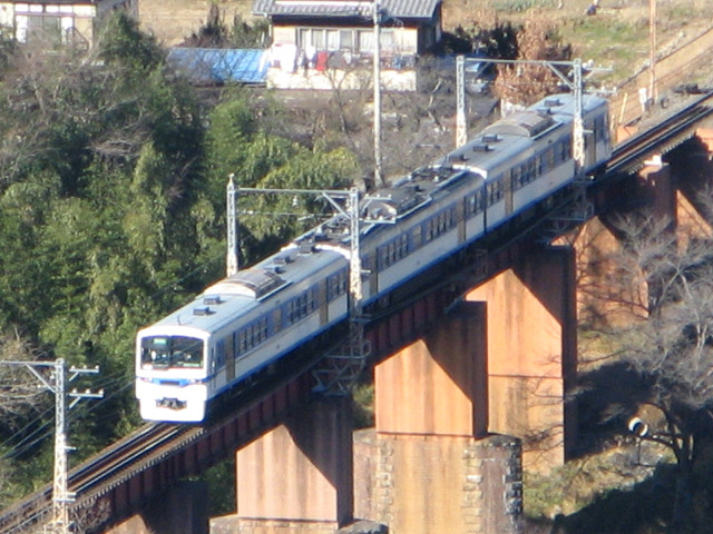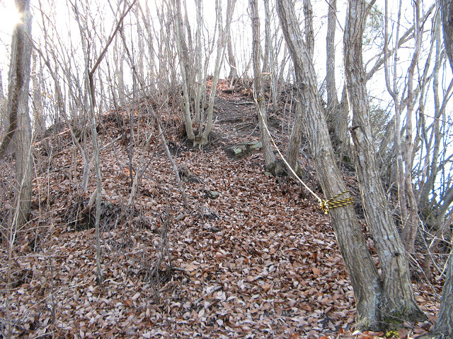 田野城 ●田野城(埼玉県秩父郡皆野町) 次に向かったのは田野城で、千馬山城の出城の性格を担っていたと思われる。 12月も下旬になり、木々の葉も落ちて絶好の見ごろを迎えている。 山の東には何故か赤城神社があり、その付近から登れそうな感じがした。 しかし、それが大きな誤算を招いてしまった。 とちゅうから道が無くなり、藪だらけの道になってしまったのである。 そんな儀一の前に立ちふさがった物は・・・ 岩壁・・・。 藪やら急斜面はなんとか乗り越える事はできるが、流石にコイツは厳しい。 写真では分かり辛いが、ほぼ直角に岩が張り出してある。 なんかこの岩壁をみると埼玉県最凶といわれる比丘尼城を行った事を思い出す。 運良く下側は獣道になっているようで、道が続いている。 この道を使って岩壁の真下を回りこんでみた。 どうにか岩の無い尾根道に出たようだ。 しかもご丁寧にトラロープまで張って下さっている。 もっともこのトラロープの向こう側にはあの岩壁があるので、立ち入り禁止の意味合いも兼ねているのかも知れない。 頂上に着いたら先客さんが居られちょっとビックリ。 もちろん城館跡の探訪というよりハイキングで来られたのであろう。 (ので頂上付近の写真が残念ながら撮れなかった) 丁度木が無かったので頂上からの風景を撮影。 ほんの僅かな削平地があるだけで、城館跡としての遺構は見当たらない。 でもこれだけ長瀞町(中世では藤矢淵郷)を望む事ができるのはよいことだ。 ついでに昼食をしながら、秩父鉄道の電車を撮影してみた。 電車の種類は分からないが、名撮影ポイントである荒川の鉄橋を渡っている所。 流石にこのアングルはこの田野城からでなければ撮れないものである。 山が三つ連なっているが、その一番西にある山には琴平神社が祭られている。 帰りはハイキングコースの案内の逆(親鼻駅方面)を歩いてきて無事帰還。 にしてもあの岩壁は直登をしない限りお目にかかれないよい所だった。 もしかすると現役時代にはあの岩壁を露出させてかの比丘尼城の如く威圧させていたのかも知れない。 (参考:比丘尼城の遠景) [0回]PR