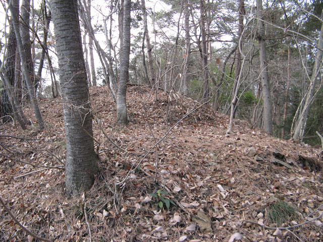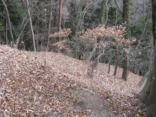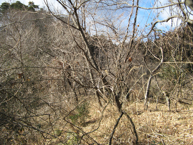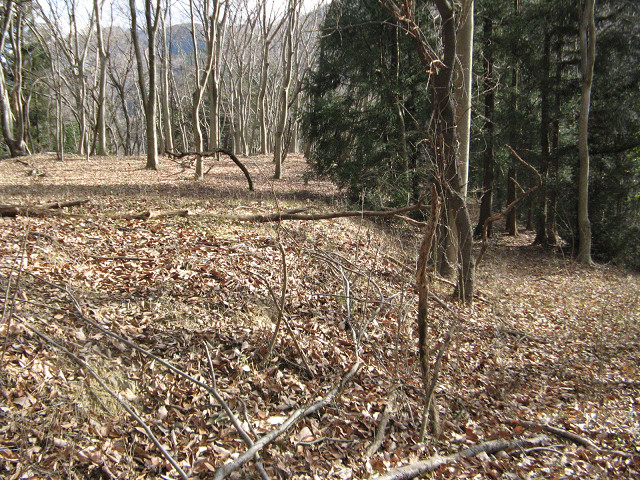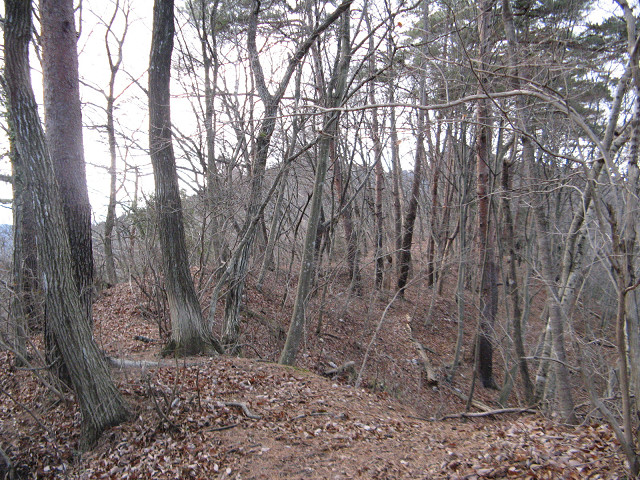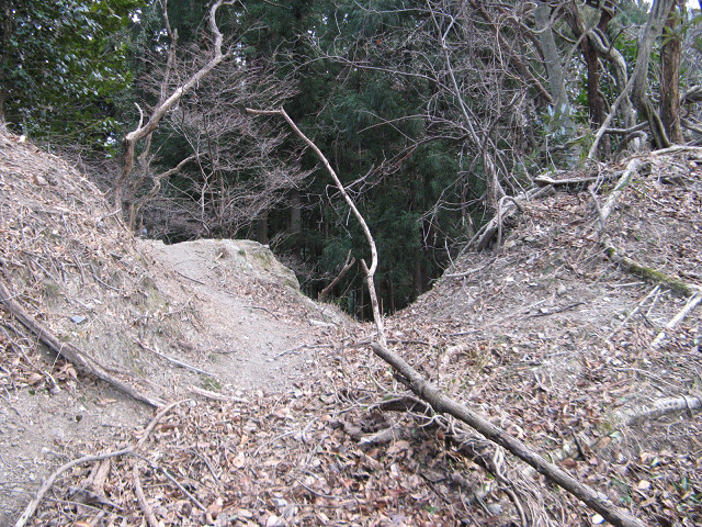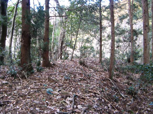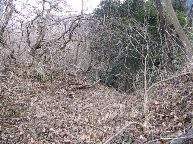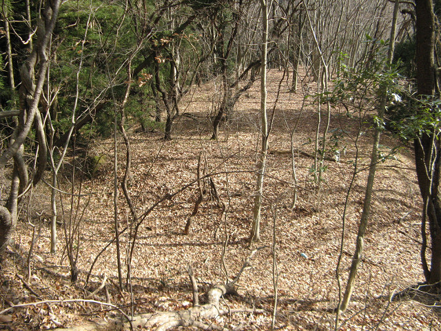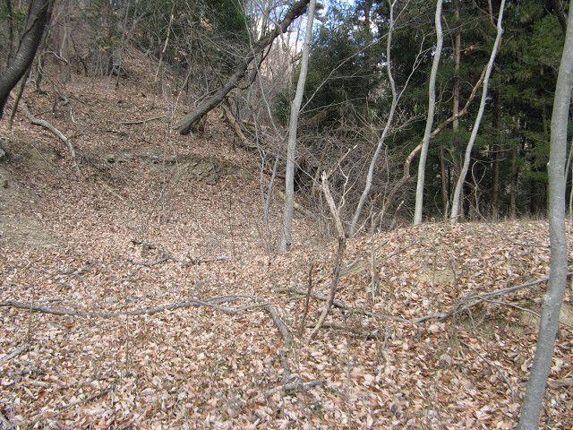野野上砦 ●野野上砦(群馬県甘楽郡南牧村) 大塩沢地区の城館跡付近を回った後、通り過ぎた野野上砦の聞き込みに行く事にした。 事前に集めた情報によればこの山が野野上砦との事だが・・・ とりあえず地図を見て確認等をしていた。 ・・・すると散歩中の方に声を掛けられた。 どうやら地元の方のようで、この辺りの山の登り口などを色々と聞いてみた。 広いところが葡萄畑になっていたが、今は放置されているという。 あらら、遺構は葡萄畑になっているのか?それでも確認してみたくなってきた。 「このまま登っていけるよ」という情報を信じ、いざ直登を敢行する。 30mほど登ったところのピークだが、遺構らしきものはない。 どうやら砦はそのまたむこうの山のようだ。 そのまま尾根伝いに進んでいくと・・・ 猛烈に笹薮に包まれてしまった元葡萄畑へ。 かなり生い茂っているので進むのに30分程時間を要してしまった。 帰るのちょっとうんざりする。 葡萄畑の猛烈な藪を抜けて、尾根伝いに登り始めた所で古井戸発見。 これも先ほどの人から聞き込みして知っていた。 こう見ると近代でも井戸を使っていたような構造に見えるのだが・・・実際はいかに? 更に登って空が見える場所に来た。 周辺を見渡してみたが、この辺りではないようで、先が長い。 おお、やっと堀切にめぐりあえた! 一旦上まで登って周辺の把握をする事に。 ここは松が生えていて、周辺から見ても目印になりそうだが、削平されたような様子がない。 今度は図面に描かれている尾根を降りる、いよいよ砦の本体にご対面となる。 わ!結構広い。 もっとショボイ遺構を想像していただけに、不意を突かれた気分だ。 砦は本曲輪の周囲を腰曲輪が囲む構造で、尾根は強引に掘り切って遮断している。 いや、こんな豪快な遺構にめぐり合えるとは。感謝。 何気に猫城にも散乱していた謎の薬品の容器も健在。 これってもしかして除草剤かなにかか? いや~、それにしても見事に削平されていて、大変美しい。 巧妙さに欠けるかも知れないが、こういう力に任せて削平されている地形も好きだったりする。 先の方はグルッと回る腰曲輪と2段に作られた平場があって急落している。 いい遺構を見れてあの葡萄畑の猛烈な藪を越えてきた甲斐があったってもんだ。 ここで色々と写真を撮りまくってしまったのであった。 先ほどの藪を通過するのはこりごりなので、別の道に活路を見出す事にした。 それでここに来る直前に見た尾根筋に来れた。 この辺りは大体が自然地形で、削平された地形は見受けられなかった。 となるとこの野野上砦とは南牧川沿いを監視する目的の砦だったのか? 進路を北西に向けると堀切のある場所に着く。 でもこれは堀切というより峠道の切り通しの様にも思える地形。 !? もしかして・・・この峠道を辿って行けば藪を通らず帰れる? 道なりに北側に降りてきたら予想通り集落のある場所にたどり着いた。 この辺りまで車で上がって来れるので、この集落に来ると良いようだ。 って事で無事南牧川沿いの道まで帰ってこれた。 記念に入口の場所を撮影しておく。 写真の看板には四ツ又山という山の登山道にもなっているようである。 ついでに野野上砦入口と書いた方がいいかも。 かくして無事降りて来る事ができた・・・それにしても腹が減った。 [0回]PR