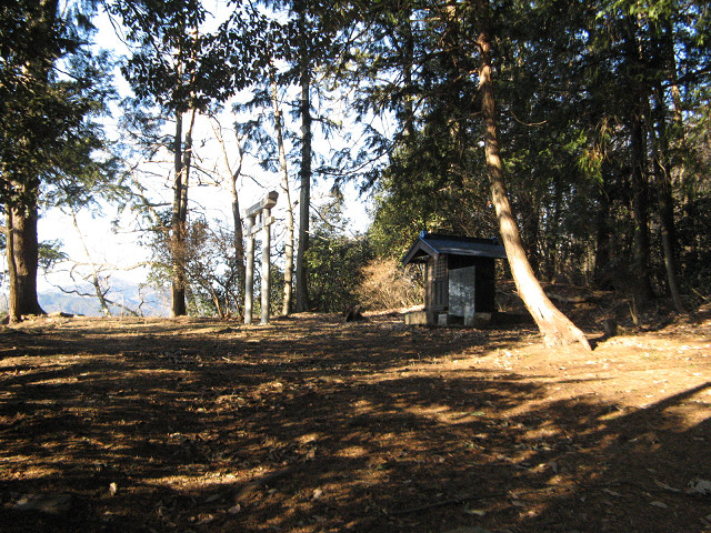 根岸山砦 ●根岸山砦(埼玉県秩父郡皆野町) 荒川流域に砦で、堀切があるという噂があるが真相を確かめるべく訪問。 南面は荒川が荒削りした跡と思える岩壁になっていて、自分はこちらから登るのはほぼ無理。 このまま東側に回りこむ。 山沿いに東へ歩いていくと十二神社への入口を示す石碑がある。 砦のある山へはこの石碑が目印となる。 登りは写真の直登コースと比較的緩やかな蛇行コースがある。 少々体力を温存したかったので、今回は蛇行コースでのんびり歩いていく。 枯葉の滑りに気をつけながら登っていくと、途中で遺構とも思える平場に出る。 山裾は広かったと思ったが、この辺りで両側は急に落ち込んでいる。 その事を考慮すると城戸なのかも知れない。 十二神社のあるピークに到着する。 上は綺麗に削平されており、中央には十二神社の社がある。 周りの風景を見る。 南方は眼下の荒川越しに秩父盆地を見渡す事ができる。 千馬山城は少々奥に入った所にあり、こちらの方面は蓑山があって見ることができない。 そこでこの方面の監視を補う形でこの砦が作られたのがよく分かる。 西側の標高の高いところにも行ってみた。 こちらは完全に自然地形である上に、北側が緩やかである。 私見になるが西には宝登山があり、この場所は写真の宝登山に見下ろされる形になる。 そこでこの場所を放置して十二神社のあるピークを選んだのだろう。 つまりは高所に作る事よりあの場所に作る事で目的を果たせているので作っていないという事か。 さて、肝心の堀切は? ・・・コレの事を指しているのか、大目に見ても土橋という感じであろうか? 自然地形にも見えなくも無いので判断が難しい所。 ピークを削平したという到ってシンプルな遺構だが、実用的という印象の受ける砦であった。 [1回]