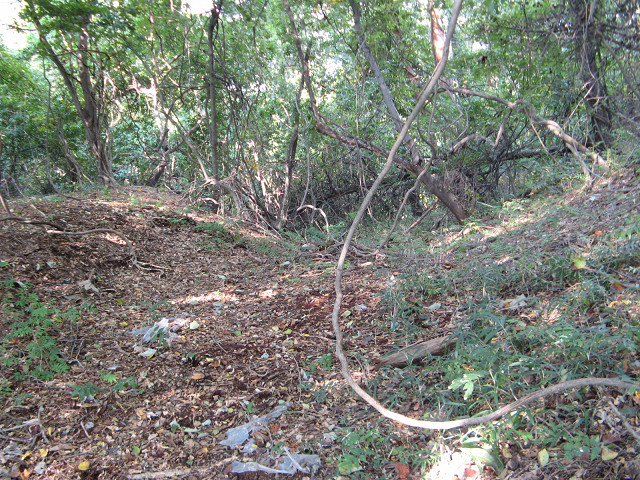 猫城 (群馬県赤城村) なんだか遺構の確認作業などがあやふやになってきたが、次なる城へ。 次は名前のカワイイ猫城である。 猫山城とも言い、「根古屋」が転訛して猫になったという。 元赤城村役場前を過ぎ、麓から猫城を見上げる。 標高もそんなに高くなく、しばらく城館探訪をしていなかった自分にはピッタリな城だ。 こちらは猫城を北西側から見たところ。 尾根伝いに行けるかと思ったが、独立丘だったようだ。 周囲をグルグルと何周もした上、北側の林道沿いに車を停め行くのがベストと判断。 さっそく路肩に車を停めて登り口を捜す。 ずっと猫城沿いに東に進むと畑の中に。 この先にも少しだけ行けたが、藪が酷かったのでこの辺りから直登する事にした。 人は入らないけど獣道はしっかり残されていた。 ちょっと後を振り返る。 藪が凄くて分かり辛いが先ほどの畑付近をちょっと登った所から撮影してみた所。 全然比高差が少ないので、登るのは実に楽だった。 尾根上の道に出る。 流石に人も歩いているだけあって、歩き易い。 あれ?城への道が歩き易くていいのかな? ようやく削平された地形を発見。 それにしても地形がかなり緩い。 ある程度山城を見慣れた方でないと、削平地とは分からないぐらい地形が緩くなっていた。 所々の木の皮が剥がされている。 これは単純に鹿などが木の皮を食べたからに他ならない。 という事はこの辺りには鹿糞のトラップが仕掛けられている恐れも・・・。 猫城の堀切。 緩すぎて堀切にある萌え度が低い。 これじゃ城館まがい地とあまり変わりがないような。 一番削平が綺麗に思えた一番西の曲輪へ。 っとこの辺りには謎の物体が散乱していた。 ラベルもなく、周辺には十数個ぐらい落ちている。 中にはフタの取れた物もあり、中身のある物はそれなりの重さがあるようだ。 ・・・これはシャンプー?猫城の謎は深まる。 そのまま西に下りてきたら、車を停めた林道の側に出た。 写真は丁度出てきた部分を撮影したもので、ここからは入る気がちょっと無い。 ちょっと下に歩くと、西に子持山がその姿を見せていた。 今朝は雲に覆われてまったく姿を見せてくれなかったのだが、今になって会ってくれたような感じだ。 再び別の角度から猫城を見上げる。 やはり行った山城の遠景写真はそれなりの味がある。 ちなみに猫の寄居もあったのだが、遺構喪失との事で思い切りスルーしてしまった。 今度この辺りに来たら立ち寄らないと・・・。 [0回]