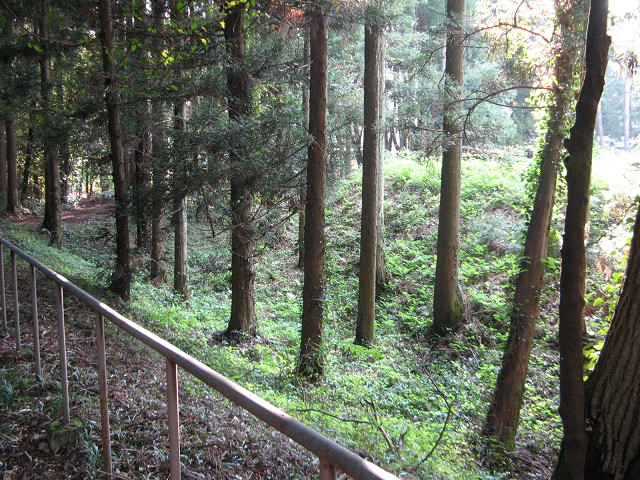 勝保沢城 (群馬県赤城村) 猫城の探訪中、ちょっと気になっていた「赤城歴史資料館」へ行ってみる事にした。 赤城歴史資料館は入館料大人1人100円。 情報を期待して入館するも、メインは古墳時代の土器や農耕具ばかりで城館の事はまったく無かった。 ちらりと赤城村誌を拝見させていただき、退出なり。 それより気になっていたのはこちらの堀。 そう、赤城歴史資料館は中世期の城である「勝保沢城」の曲輪に建っていたのである。 ここって今まで見てきた旧赤城村の中で一番遺構が綺麗に残っているみたいだ。 本曲輪と思われる一角は手すりが備わっており、ちょっと進入はできないようだ。 だが草は刈られており、その美しい遺構を見る事ができる。 何気にここで何枚か写真を撮ってしまった。 この位の堀が残っていると本当に嬉しくなるものだ。 先の津久田城もこの位遺構が残っててくれたらと思ったりも。 ぐるっと周って堀底をちょっと経由して再び階段を登ると歴史資料館に戻る。 これだけ良い遺構が残されて居るにも関わらず、解説板一つも見つからなかったのは残念だ。 もしかして見つからないだけで、どこかにあったのだろうか? 駐車場挟んだ反対側の竹やぶも実は堀跡である。 ちなみにこの堀の向かいの寺も勝保沢城内だったというが、遺構は乏しいという。 歴史資料館があるので、この城の探訪に関しては問題無い様にみえるが、 実はその南側は幼稚園でヘタにカメラを持って歩いていると保護者に誤解される恐れがあるので要注意。 でもいい堀を見させてもらって感謝。 [0回]