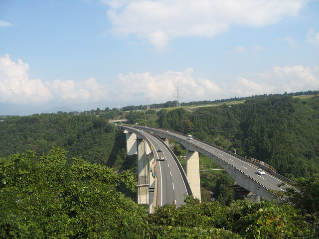 長井坂城 (群馬県赤城村・昭和村) 深山の五郎屋敷の意味不明の遺構を見た後は、ついに名前は聞いていたけど行った事がなかった長井坂城へ向かった。 近くまで行くと長井坂城への案内があった。 さすが県指定史跡だけの事はある。 っと案内があったのを見て油断していたら・・・ ゆるい傾斜の畑をグルグルと周ってしまったのだった。 あれ?案内通りに進んだ筈なのだが・・・ (実は途中で別の案内を見て移動していたようである) これはいかんと地図を見直し、ようやくそれらしい森を発見した。 この雰囲気は城館があると予想させる。 それにしても見晴らしが良い。 沼田方面が一望でき、麓を流れる利根川や国道17号線を一目で見る事ができる。 では早速遺構を見に行こう。 久々の有名城郭の遺構。 こじんまりとした遺構も好きだが、たまにはこういう巨大城郭を見るのも目の保養になる。 竪堀(?)をコッソリ覗いてみる。 急角度な上にとても崩れやすそうな感じ。 この地形ならもはや竪堀は必要ないな。 崖っぷちである本曲輪は崩落が進んでいるようで、本来の柵よりさらに内側に新たな柵が設けられていた。 落差が軽く100m以上あるここで落ちたら、まず無事では済まない。 それはそうと下はどうなっているのか気になる・・・道路があったような。 他サイトでよく見ていた長井坂城の石碑は本曲輪ではなく三の曲輪付近にあった。 しかも、時間帯が悪かったようで思い切り逆光で撮影してみた。 この城は朝の時間帯の訪問はよろしくないようだ。 城の遺構もそうだが、それと同じように期待していたのがこの関越道の橋。 ダムなどもそうだが、こういった巨大建造物は何故かそそられる事が多い。 さっそくこの橋も堪能する事に。 橋を真下から見上げてみた。 丁度橋脚の耐震工事中らしく、特殊なゴンドラに乗った作業員の皆様がセワセワとお仕事に励んでおいでであった。 このゴンドラって上下に稼動するのかちょっと気になる所だ。 それにしてもあまりの巨大さにしばらく見とれていた。 この橋が実は二車線道路なのだから個人的にその大きさに驚く。 では・・・お楽しみの長井坂城とこの関越道のツーショットを取るべく対岸の台地を登っていく。 長井坂城に吸い込まれる関越自動車道の絵。 ・・・ちょっと冴えないな。 地図を見ながら結構いい図になると期待してしまっていたのだが。 っという訳で長井坂城の探訪を終え、次に探訪する城を考えるのであった。 [0回]PR