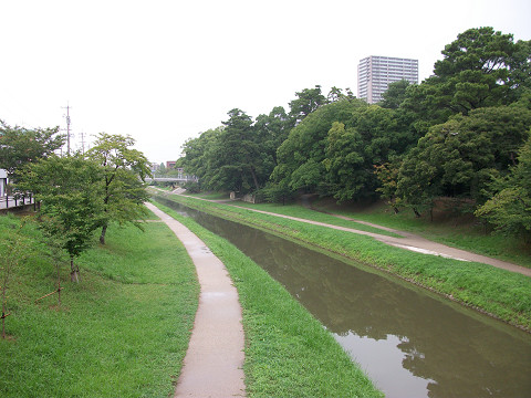 緒川城(愛知県知多郡東浦町) 緒川城所在地 徳川家康の生母於大の方の出生地と言われる場所で、水野氏に馴染みの深い場所である。 埼玉県内にも水野氏に関わる城館跡が二ヶ所あるので、ちょっと遠いが訪ねてみた。 勢い余って城は高い所という認識から於大公園に来た。 でも公園内に設置された地図を見ると・・・町役場より北西の方角だと判明。 ここから歩くのはちょっと遠いので、資料を集める傍ら図書館に停めさせて戴く事にした。 幸い(?)東浦町の図書館は職員さんがコピーを取ってくれる所だったので、待ち時間を利用して緒川城へ。 コピーを依頼して外に出ると・・・雨降ってきてた。 折角愛知まで遠征に来ているのだから時間が惜しい。 ので持参した折りたたみ傘を差して緒川城の方向へ向かう。 ここまで歩いて来るまでには足がズブ濡れ状態に・・・。 この緒川城に近づいた途端の大雨、これは何かあるのか?? 一応現場を記念撮影してみたら、フラッシュに水滴が反射する。 豪雨の中グルッと町内を一回りした所で、非常に目立つ丘がある。 ふむ、これは調べない手はないと思い、その現場に近づく事に。 そこは公園になっており、緒川城の城内であった。 では一番高い所へいける所まで行ってみよう。 そこには緒川城の石碑と解説板がおいてあった。 後の土盛りは物見台か? でもここまで来れたのでちょっと安心。 解説板にはご丁寧にも縄張り図付きであった。 ここはかろうじて残された土塁であったようだ。 って事は先ほどの公園こそ本当の本曲輪だったのだな。 土塁から降りて本曲輪より土塁を見る。 こう見ると唯一のこされた土塁はよい高さがあるのが分かった。 流石に下半身が川に落ちたように濡れているので、この度は撤収する事に。 図書館に帰る途中、排水溝から雨水が噴出しているのを見てしまった。 うーん、ここまで排水処理が付いていけない程降ってるとは・・・ かくして無事図書館に戻り資料をいただき、次なる目的地に行くべく車を安城方面へ走らせた。 ちなみに今回の遠征で唯一の尾張国の城館跡であった。 [0回]