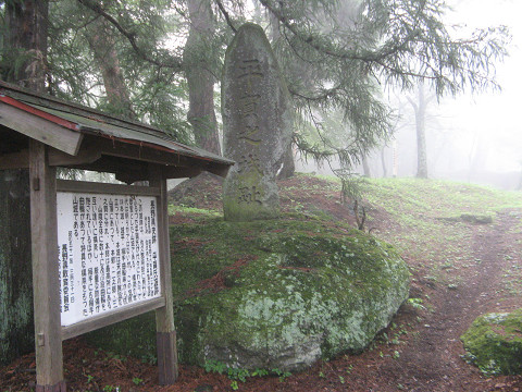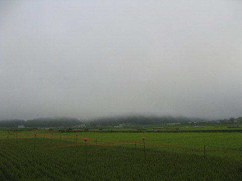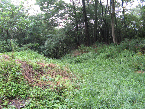 太田部離山狼煙台(長野県佐久市) 長野県に入って第一に訪れた城である。正確に言えば狼煙台になる。 時間は今朝の5時、長野県は素晴らしい霧に包まれている。 離山という名前に相応しく、その狼煙台は水田にポツンと取り残されたようにある。 南側からのアクセスを試みる事にした。 QBBチーズでおなじみの六甲バター社の工場側の道を通り、普通車じゃちょっときつそうな道にたどり着く。 オフロード車でも好き好んで行かない方が良さそうな道である。 途中で意味ありげな平場が段々状に設けられている。 果たしてこれは狼煙台の遺構か?それとも? 離山の上辺りに来た所、霧がかかっていて視界が悪いが千曲川沿いの景色が一望できる。 他からもこの離山の形状が目立つため、目印になる事は間違いなさそうである。 平場はある・・・平場はあるがこれを狼煙台の遺構と決める決定打に欠く。 それにしても草が濡れていてズボンが湿ってきた。 ここなんか堀切に見えなくも無いのだが・・・ここまで曖昧な地形だと城の遺構にも見える見えないで困ってしまう。 離山を降りてくる最中、恐らく小海線の始発電車と思われる列車の通る音が聞こえた。 周囲は広々としているため音が一段と大きく聞こえた気がする。 って事で次なる場所に移動することにした。 場所 [2回]