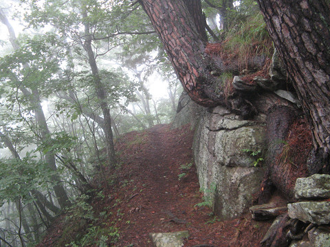 内山城(長野県佐久市) 内山城所在地 平賀城を訪ねた後、内山城へ向かった。 国道の旧道と思える道の真正面に見える山が内山城で、今回は林道が走ってないので体力勝負の山登りになる。 ふもとの園城寺を参拝させていただきつつ、駐車場に車を停めさせてもらえないか住職さんに相談させていただく。 結構若い方で、登り道の場所を教えていただきつつ、快く車の駐車を許していただけた。 では内山城へ向かおう。 ちなみに内山城へは結構案内表示が設置されているので、ある程度は迷わず行ける。 こういった案内があるだけでも大変助かる。 園城寺の東に衣笠神社があり、その右脇に城への登り口がある。 しかし、自分はそれに気付かず通り過ぎ、墓地の辺りをうろうろしてしまったのであった。 これが内山城への登り口である。 ここを見つければこの先は結構な踏み跡が付いた道なので、注意深く辿っていけば迷わず行ける。 それにしても平野部の館跡ばかり探訪していた身には、この登り道はきつかったりも。 途中にはベンチ付きの休憩所もあり、休み休み歩いていくことができる。 ただ、今回は雨が降ったようで湿っていたりするのでベンチには座らなかった。 そうこう登っていくと岩が露出したりするところがあり、険峻さを物語っている。 そんな岩場を越えて登っていくと、ようやく三ノ丸と書かれた案内板が出てくる。 ここまで来れば本曲輪までもうちょっとで到着する。 山頂付近から麓を見下ろすことができる。 付近の状況が手に取るように見渡せるので、物見に最適なのがよく分かる。 ふと見ると汗でびっしょりなので、この景色を見ながら休憩してた。 また内山峠方面も見ることができるが・・・こちらは少々見通しが悪いようだ。 しかし、この山々には戸谷城・猿田城・曾根城・鍋割城といった城々があったようで、この内山峠方面の視界を補助していたのであろう。 やはり城というのは他の城と連携を取り合って大きな力を発揮するというのが実感できる。 最高所には本曲輪があり、木で作られた碑も設置されている。 あまりここの城には人が来ないようで、割と草が生い茂っていた。 なお、本曲輪からの眺望は木が茂っているため、殆ど見えない。 足元を見てみたら、セミの抜け殻があった。 こういうセミの抜け殻を見たのは何十年ぶりだろう、ふと懐かしくなった。 本曲輪付近は腰曲輪が幾重にも連なっている。 一つ一つの曲輪を堪能してたら・・・ ガラガラ!!! !? もしかして踏んだ石が斜面を落ちていった? っとよく見たら鹿が数匹山奥の方へ逃げていった音だった。 そう、この辺りまで来れば自然も豊富で野生の動物も豊富に居る。 つい熊除けの鈴を鳴らし忘れていたので、取り出して装着した。 本物の熊に遭遇しない事を願いつつ・・・ やっとめぐり合えた、麗しの堀切様。 平場ばかりだと寂しかったので、この堀切の出現は実に嬉しかった。 実は本曲輪の西側にも堀切が二箇所あるようだが、先にここより東にある内山古城へ行ってみたいと思うので、堀切を乗り越えて東へと歩いて行った。 [0回]PR